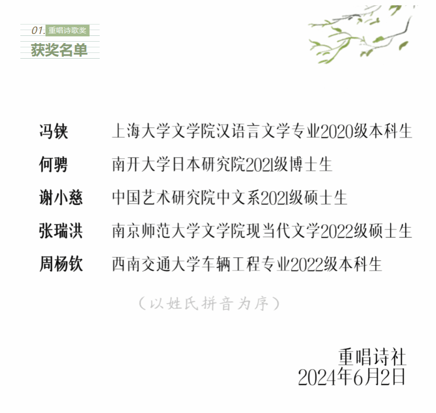 近日,中国高校诗歌奖第九届南京大学“重唱诗歌奖”揭晓,汉语言文学专业2020级本科生李骏飞(笔名冯铗)获得该奖项。