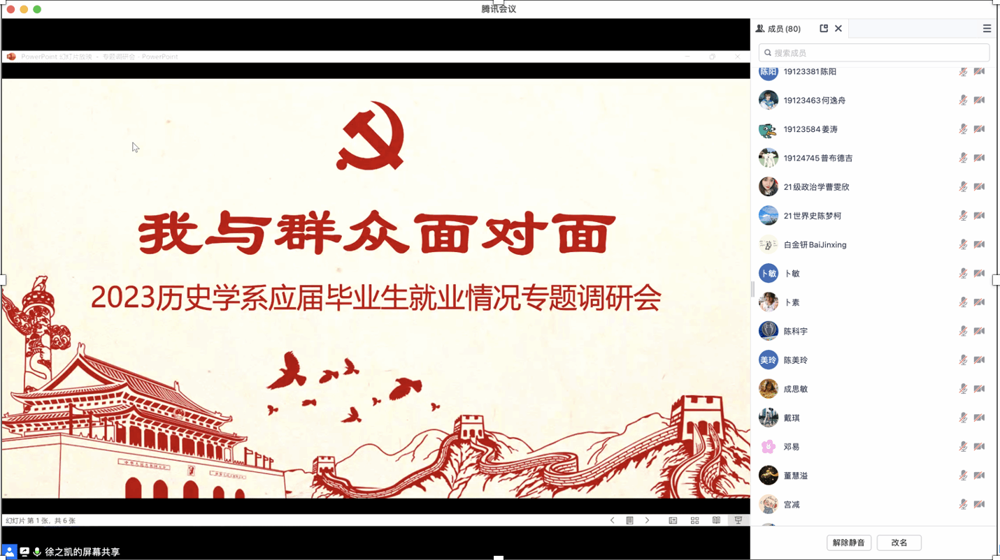 为扎实推进太阳成tyc122cc就业工作,促进毕业生更加充分、高质量就业,5月17日下午,“我与群众面对面”2023年历史学系应届毕业生就业情况专题调研会于太阳成tyc122cc306会议室以线上线下相结合的形式进行,旨在切实解决毕业生在就业过程中所遇、所忧的问题。公司党委书记陆甦颖,党委副书记、副经理丁佳蒙,副经理肖清和,历史系主任郭丹彤、历史系教工党支部书记朱虹,历史系副主任舒健,历史系教授严泉,历史系教师徐之凯、黄凯,研究生辅导员宋亚丽、刘菁、卜敏,本科生辅导员张旭以及近100名太阳成tyc122cc2023届毕业生共同参会。会议由朱虹主持。